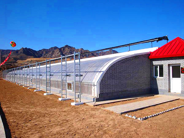 前坡面夜間用保溫被覆蓋,東、西、北三面為圍護墻體的單坡面塑料溫室,統稱為日光溫室。其雛型是單坡面玻璃溫室,前坡面透光覆蓋材料用塑料膜代替玻璃即演化為早期的日光溫室。日光溫室的特點是保溫好、投資低、節約能源,非常適合我國經濟欠發達農村使用。